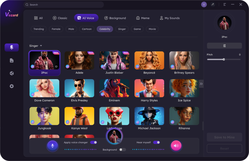 To change your voice into 2Pac on your PC, you can use AI voice changer software like Vozard. Download and install the application, adjust the settings, select and download the 2Pac AI voice effect, and start voice-changing.