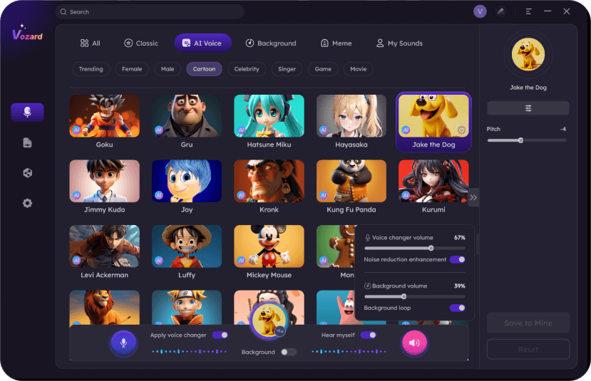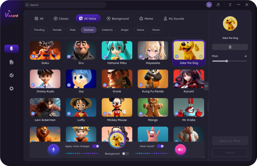 To change your voice into Jake the Dog on your PC, you can use AI voice changer software like Vozard. Download and install the application, adjust the settings, select and download the Jake the Dog AI voice effect, and start voice-changing.
