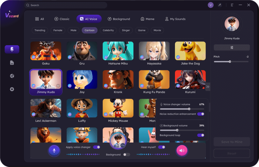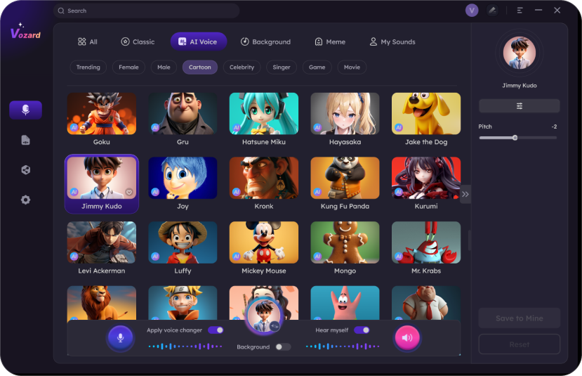To change your voice into Jimmy Kudo on your PC, you can use AI voice changer software like Vozard. Download and install the application, adjust the settings, select and download the Jimmy Kudo AI voice effect, and start voice-changing.