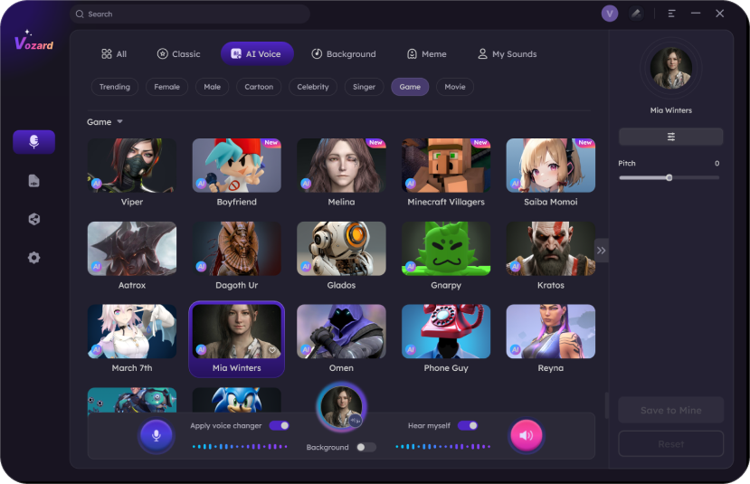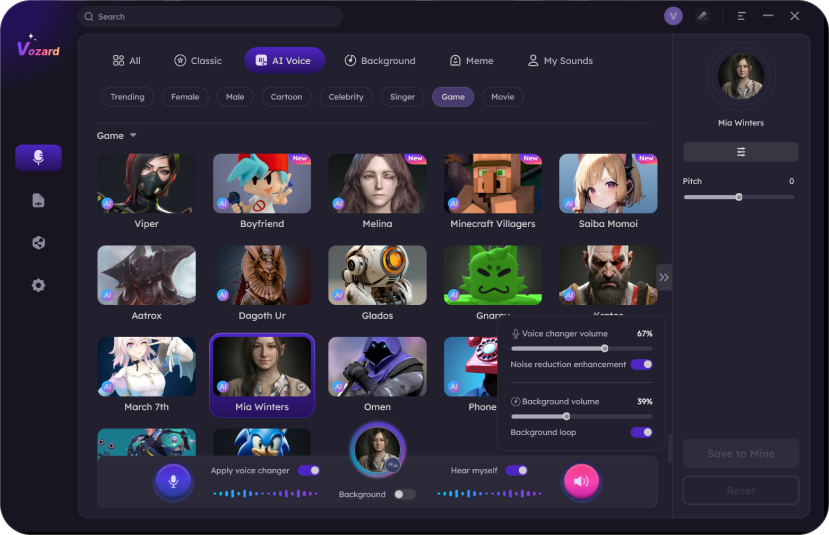 To change your voice into Mia Winters on your PC, you can use AI voice changer software like Vozard. Download and install the application, adjust the settings, select and download the Mia Winters AI voice effect, and start voice-changing.