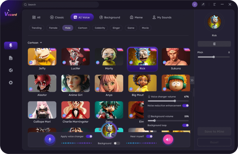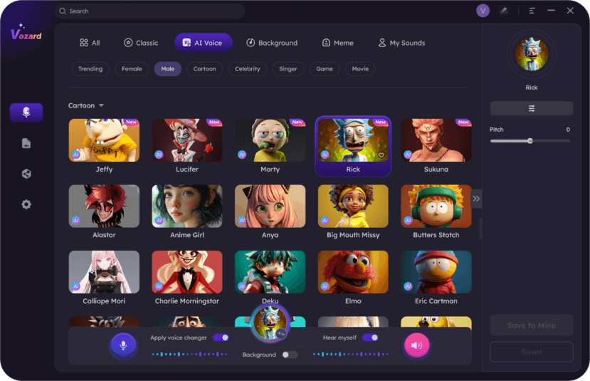 To change your voice into Rick on your PC, you can use AI voice changer software like Vozard. Download and install the application, adjust the settings, select and download the Rick AI voice effect, and start voice-changing.