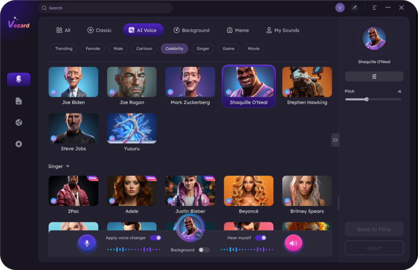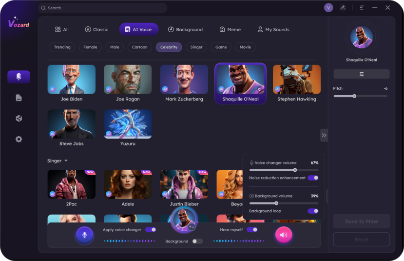 To change your voice into Shaquille O'Neal on your PC, you can use AI voice changer software like Vozard. Download and install the application, adjust the settings, select and download the Shaquille O'Neal AI voice effect, and start voice-changing.