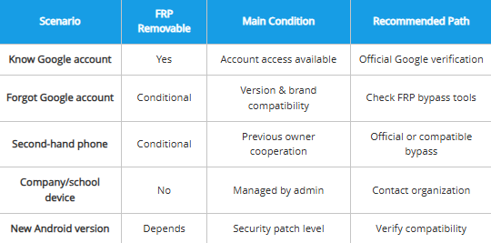 Can FRP lock be removed from your Android phone? Check your exact scenario to see if FRP bypass is possible based on account access, device ownership, Android version, and security level.