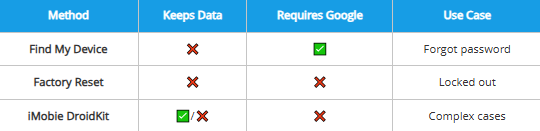 Professional phone unlock software (iMobie DroidKit) can remove certain types of screen locks when official solutions are no longer possible. It is often used in situations where users forgot both the lock screen and account credentials.