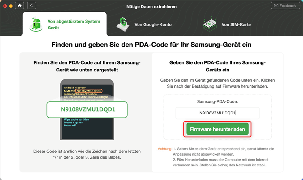 Schritt 4: Geben Sie bitte den PDA-Code in das Feld ein. Danach klicken Sie bitte auf Firmware herunterladen.