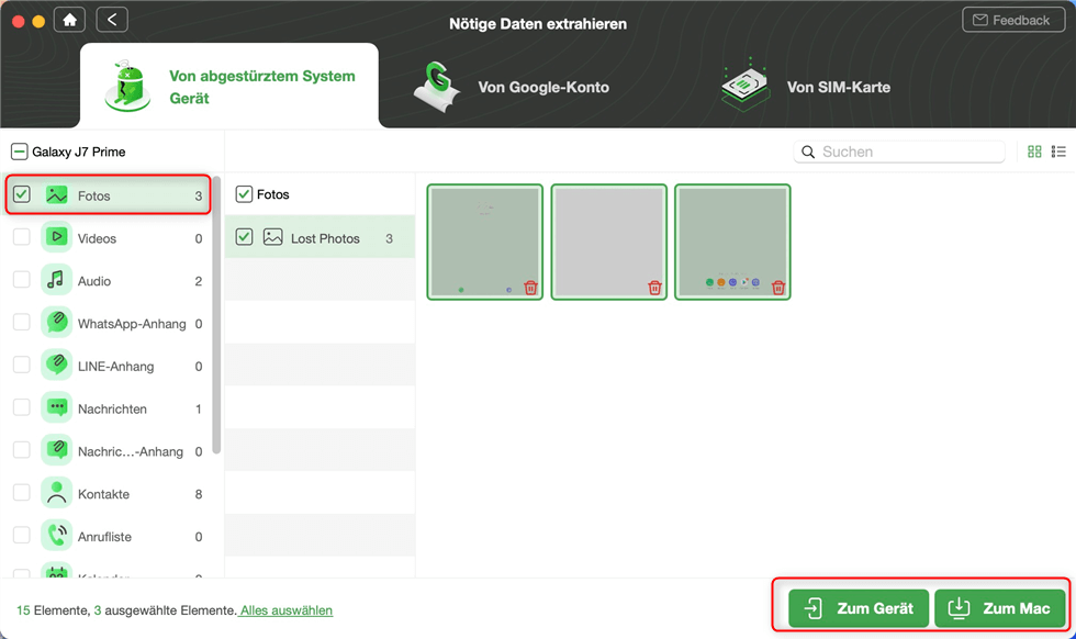 Schritt 7: Jetzt könne Sie Ihre Daten auf dem Handy in der Vorschau angezeigt bekommen, dann können sie die Daten selektiv wählen und sich entscheiden, ob sie zum Gerät oder zum PC wiederhergestellt werden.