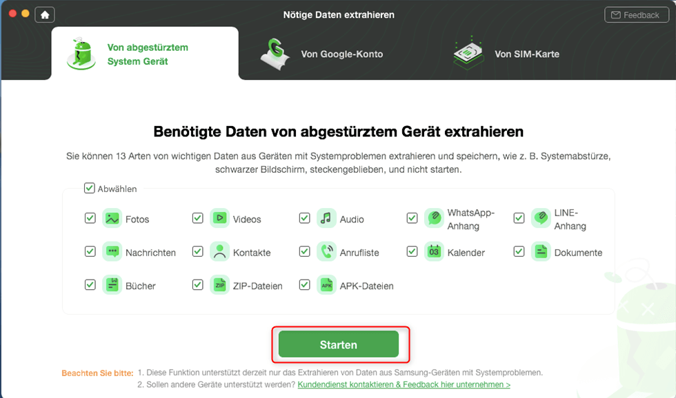 Schritt 2: Wählen Sie die Daten, die Sie retten möchten. Klicken Sie bitte dann auf Starten. Und verbinden Sie Ihr Gerät mit dem Computer.