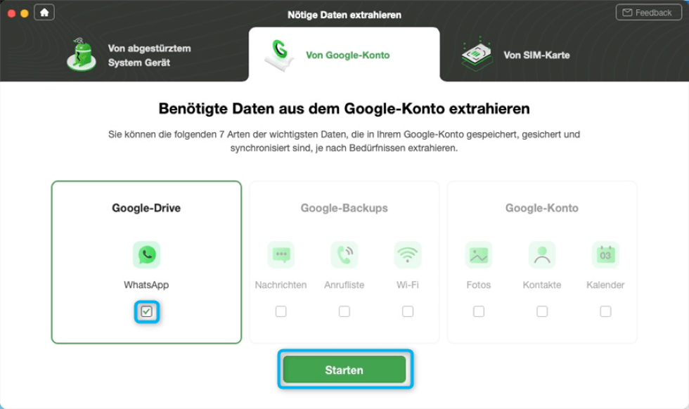 Wählen Sie bitte die Option Google-Drive. Klicken Sie dann bitte auf die Schaltfläche Sarten.