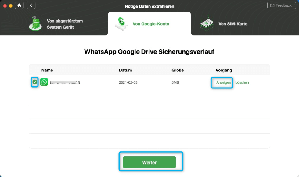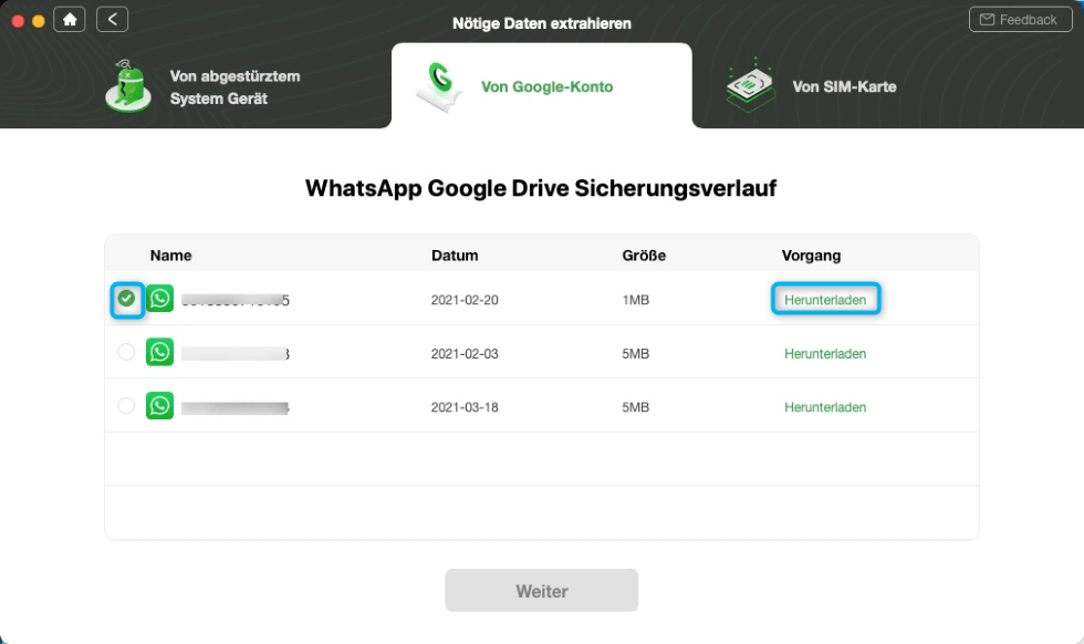 Sie können den Inhalt der Backup-Dateien einsehen. Wählen Sie bitte ein Backup zum Herunterladen aus. Stellen Sie bitte sicher, dass das Netzwerk stabil ist. Klicken Sie dann bitte auf die Schaltfläche Weiter.