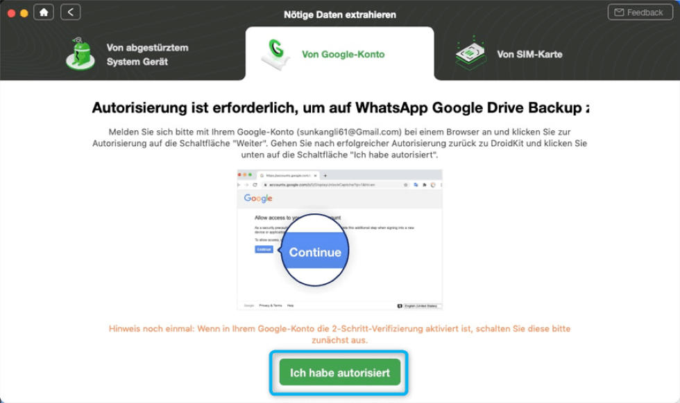 Melden Sie sich mit Ihrem Google-Konto in Ihrem Brower an, klicken Sie auf Continue und warten Sie auf die erfolgreiche Autorisierung. Danach klicken Sie bitte auf die Schaltfläche Ich habe autorisiert.