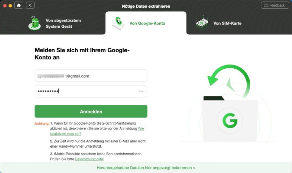 Wenn für Ihr Google-Konto die 2-Schritt-Verifizierung aktiviert ist, schalten Sie sie bitte aus, bevor Sie sich anmelden. Lesen Sie bitte diesen Beitrag, um sie zu deaktivieren.