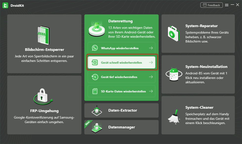Schritt 2: Gehen Sie zur Kategorie „Datenrettung“ und wählen Sie „Gerät schnell wiederherstellen“.