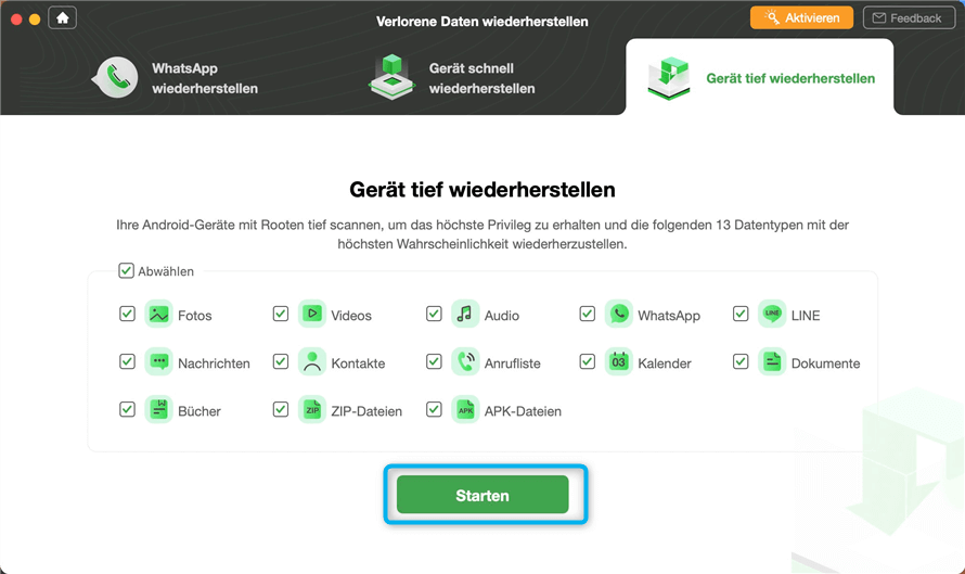 Der Schnellscan kann 13 Datentypen von einem Android-Gerät wiederherstellen. Standardmäßig hat es alle Dateitypen überprüft. Sie können einfach den Dateityp auswählen, den Sie wiederherstellen möchten. Klicken Sie dann bitte auf die Schaltfläche Starten