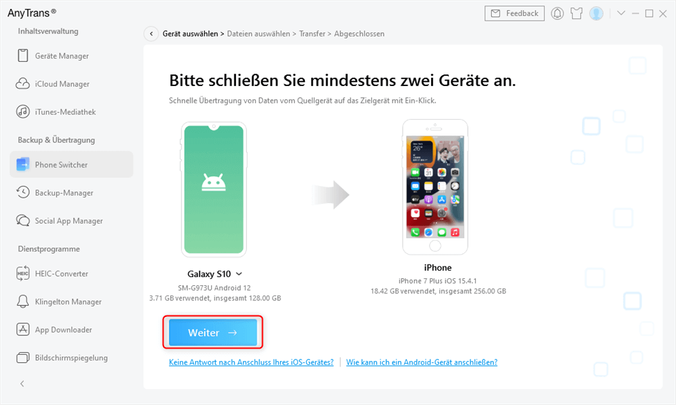 Schritt 3: Sobald die beiden Geräte erkannt wurden, können Sie mit einem Klick auf „Weiter“ fortfahren.