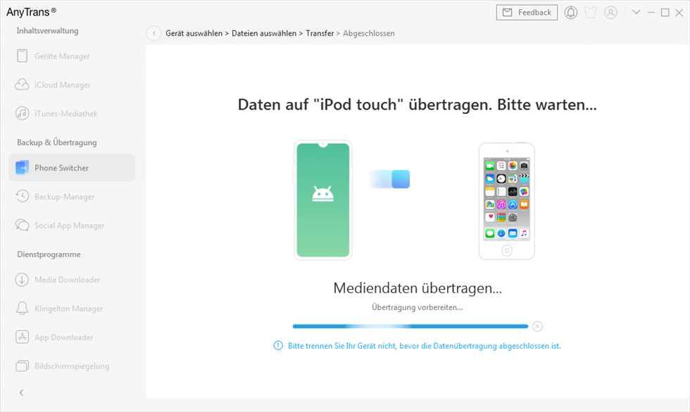 Schritt 5: Die Übertragung kann je nach Anzahl der zu übertragenden Dateien einige Zeit in Anspruch nehmen. Bitte warten Sie geduldig.