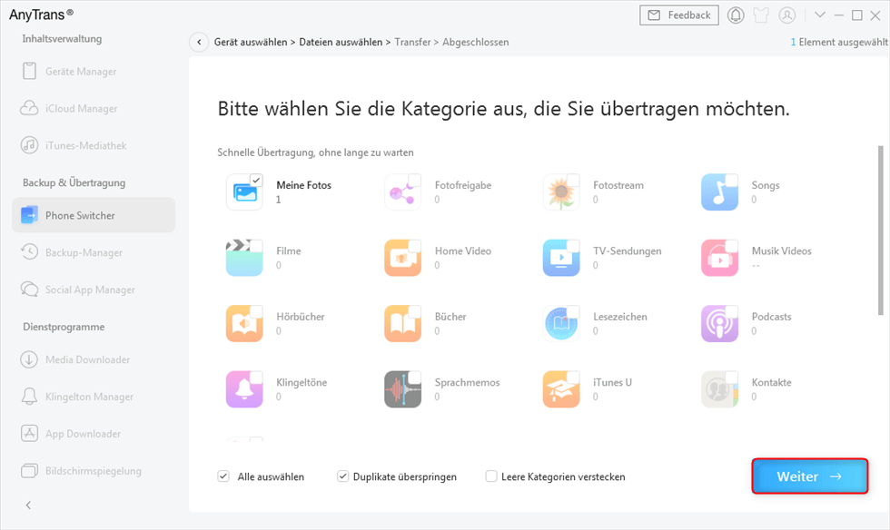 Schritt 4: Wählen Sie die Kategorie aus, die Sie übertragen möchten, und starten Sie den Übertragungsvorgang, indem Sie auf „Weiter“ tippen.