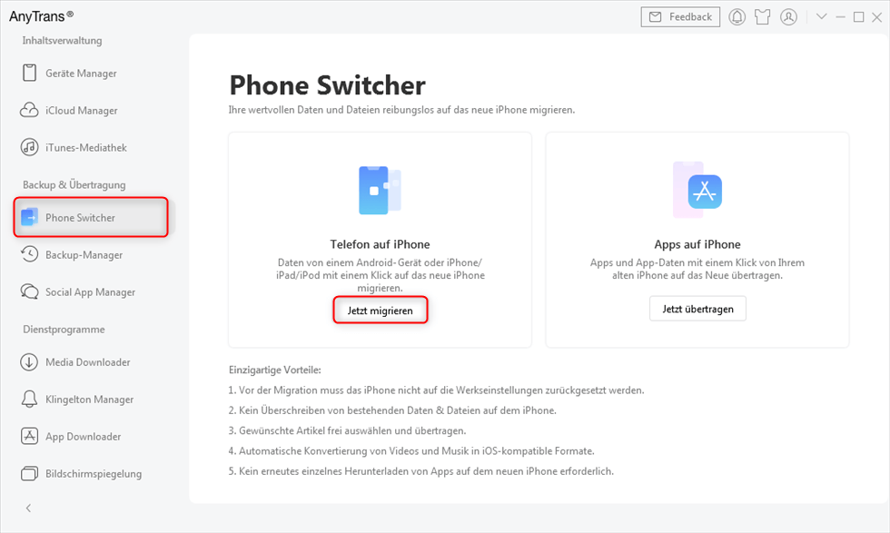 Schritt 1: Nach der Installation von AnyTrans starten Sie AnyTrans und wählen Sie den „Phone Switcher“. Klicken Sie dann auf „Jetzt migrieren“.