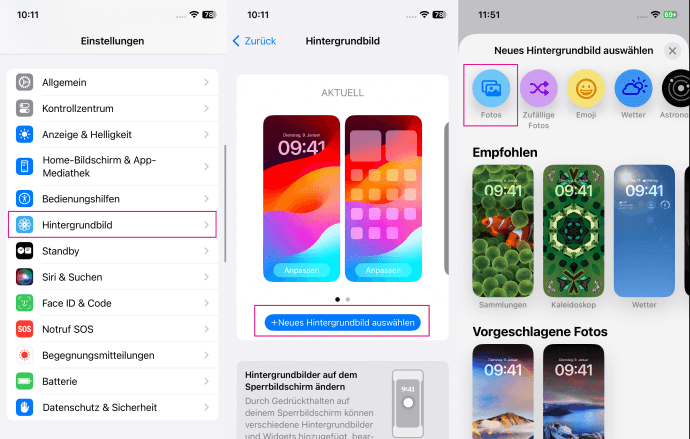 Wenn Sie mehrere Hintergründe verwalten oder ein neues Set auswählen möchten, ist dieser Weg über die Einstellungen oft übersichtlicher.