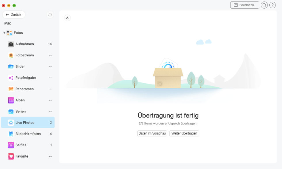 Schritt 4: Sobald die Übertragung abgeschlossen ist, wird “Übertragung ist fertig“ angezeigt. Klicken Sie auf die Schaltfläche „Daten im Vorschau“, um auf den Computer exportierte Live-Fotos zu suchen. Wenn Sie zur vorherigen Seite zurückkehren möchten, klicken Sie bitte auf die Schaltfläche „Weiter übertragen“.