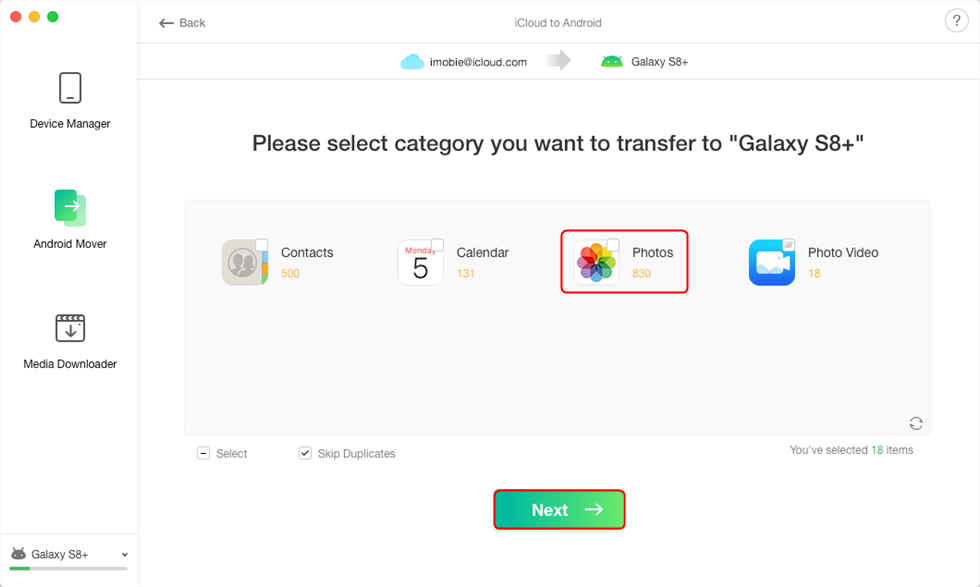 Checken Sie die zu übertragenden Kategorien. Klicken Sie auf ,,Next“, um den Vorgang zu starten. Anschließend werden die ausgewählten Fotos aus dem iCloud–Backup auf IhremAndroid–Telefon wiederhergestellt.