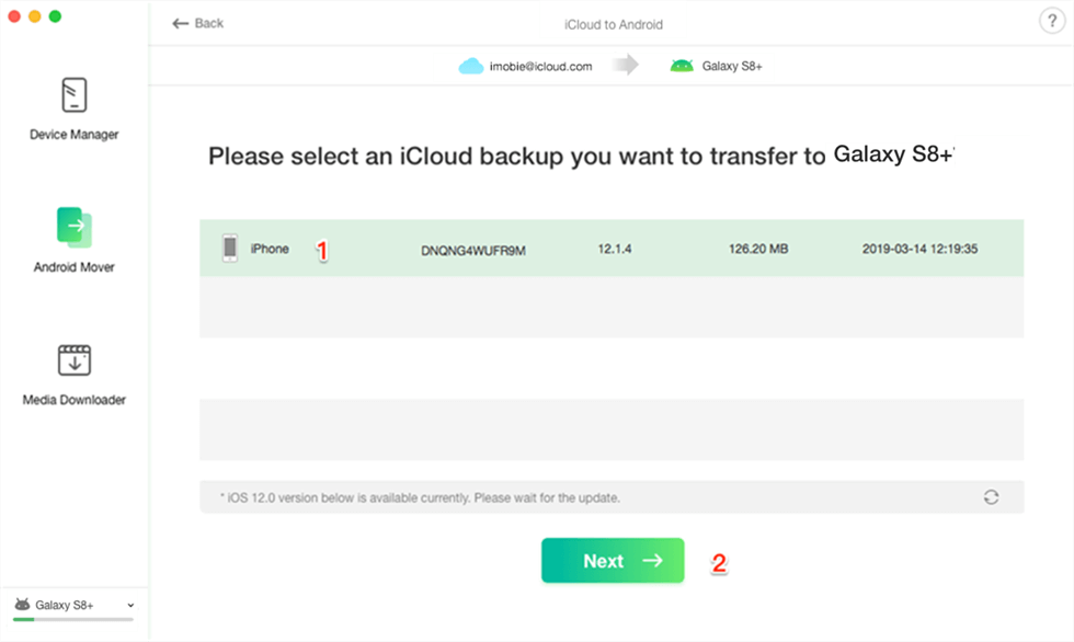 Warten Sie einen Moment und alle Ihre iCloud–Backups werden hier angezeigt. Und dann wählen Sie das Backup aus, das Sie auf Ihr Android–Telefon übertragen möchten. Daneben klicken Sie auch auf die Schltfläche ,,Weiter“, um fortzufahren.