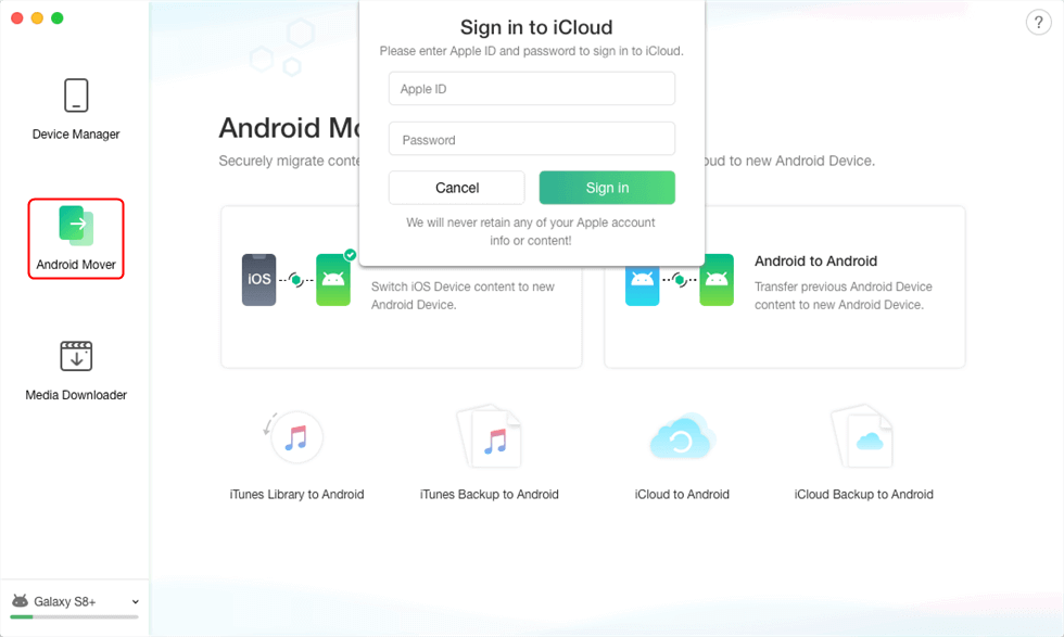 Wählen Sie im linken Bereich ,,Android Mover“. Dann wählen Sie weiter ,,den iCloud–zu Android–Modus“. Nach der Wahl melden Sie sich bei Ihrem iCloud–Konto an.