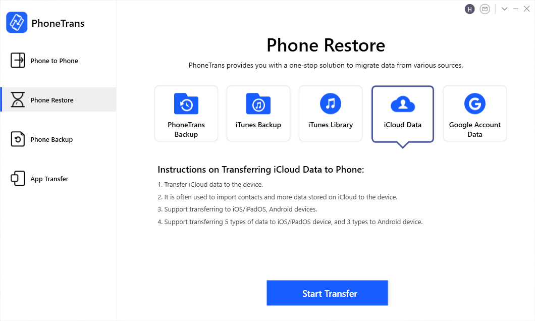 Schritt 1: Starten Sie PhoneTrans auf Ihrem Computer > Wählen Sie das iCloud-Datensymbol unter der Option „Phone Restore“