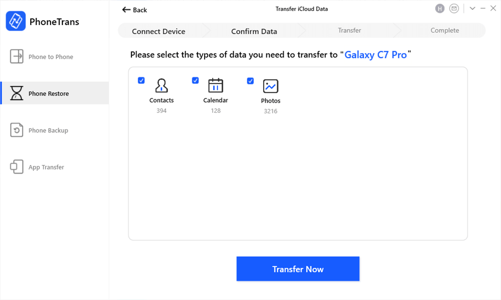 Schritt 3: Sobald Sie auf die Schaltfläche ,, Transfer “ klicken, wird die Datenkategorie angezeigt. Wählen Sie nun die Daten aus, die Sie wiederherstellen möchten, und tippen Sie auf die Schaltfläche ,, Transfer Now “, um den Vorgang zu starten.