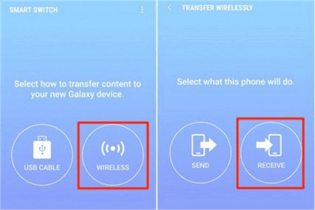 Schritt 1: Starten Sie Smart Switch auf Ihrem Samsung–Telefon > Klicken Sie auf „ WIRELESS“ > wählen Sie „ RECEIVE“.
