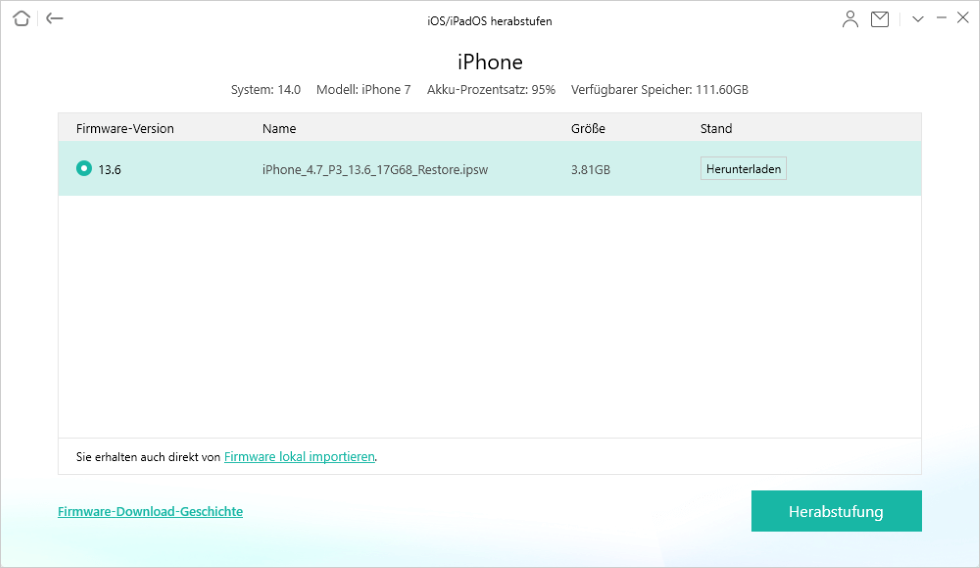 Schritt 3: AnyFix zeigt alle kompatiblen Firmware-Versionen für Ihr Gerät an. Wählen Sie Ihre gewünschte Zielversion aus (z. B. iOS 26) und klicken Sie auf „Herunterladen“.