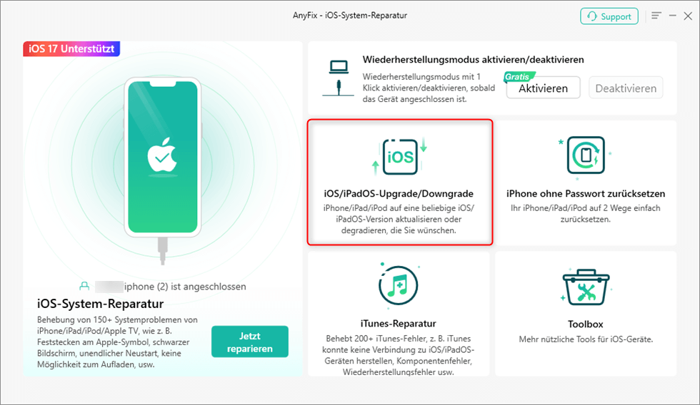 Sollte die Installation von iOS 26 mit den genannten Methoden nicht möglich sein, können Sie mit einem professionellen System-Upgrade-Tool wie AnyFix Ihr iPhone dennoch sicher aktualisieren oder bei Bedarf auf eine frühere iOS-Version zurücksetzen.