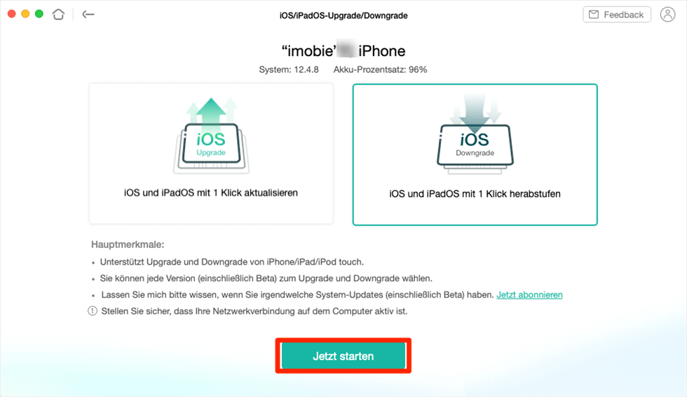 Schritt 2: Verbinden Sie Ihr iPhone über ein Lightning-Kabel mit dem Computer. Wählen Sie die Option „iOS/iPadOS mit 1 Klick aktualisieren“ und klicken Sie auf „Jetzt starten“.
