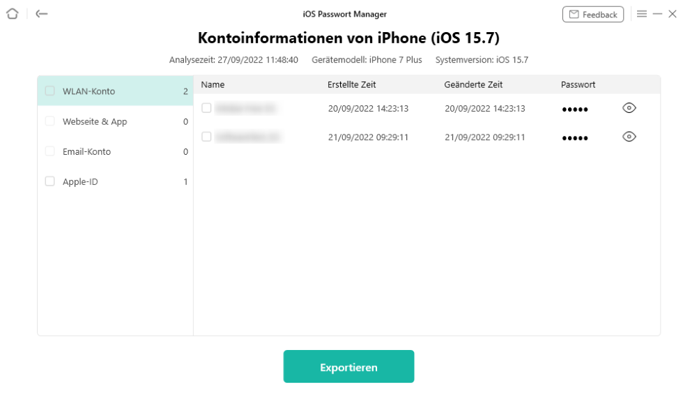 Schritt 6: Nach Abschluss des Sicherungsvorgangs sehen Sie alle WLAN-Konten und -Passwörter, Website- und App-Anmeldekonten und -passwörter, E-Mail-Konten und -Passwörter, Apple ID usw. Und Sie können die Kategorie oder bestimmte Elemente für den Export auf Ihren Computer auswählen.