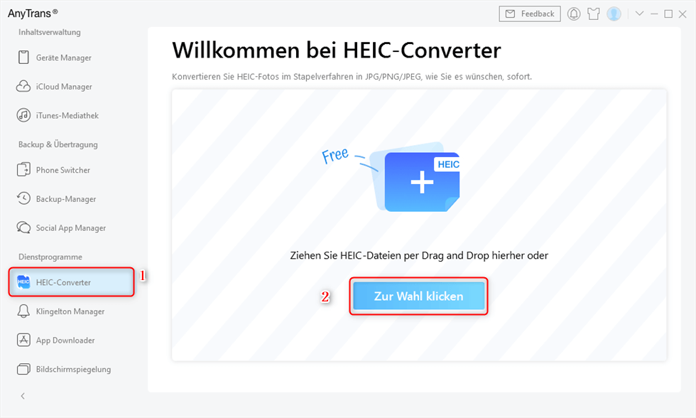 Schritt 1: Installieren und starten Sie AnyTrans nach dem Herunterladen > Klicken Sie links auf „HEIC-Converter“