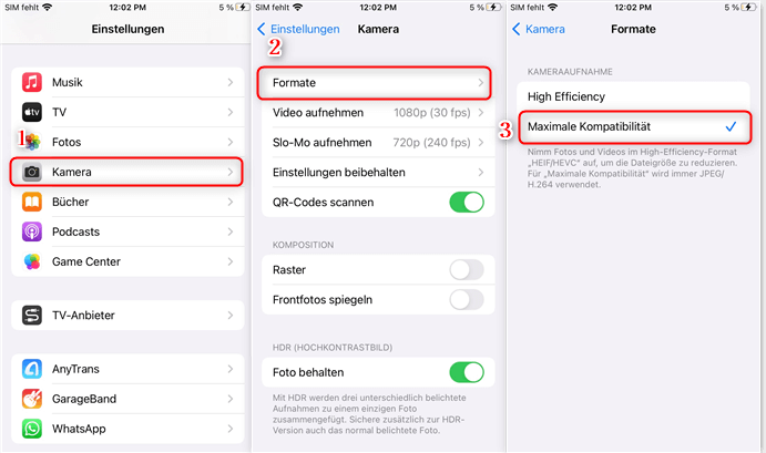 Schritte: Klicken Sie auf „Einstellungen“ > „Kamera“ > „Formate“ > Haken Sie „Maximale Kompatibilität“ unter „Kameraaufnahme“.