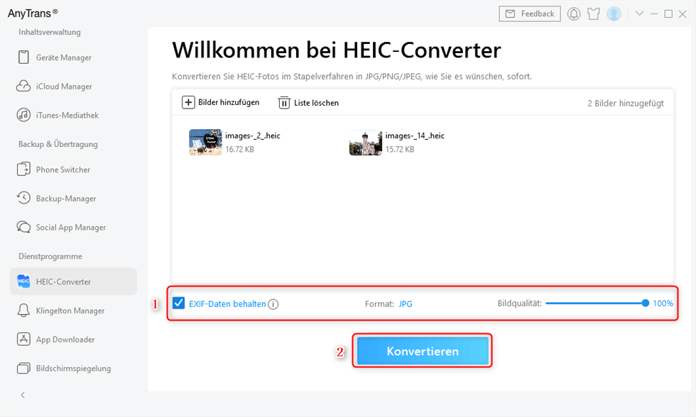 Für größere Foto-Mengen ist eine spezielle Software deutlich effizienter. Ein empfehlenswertes Tool ist AnyTrans. Es konvertiert nicht nur stapelweise, sondern überträgt die Bilder auch direkt vom iPhone auf den PC – alles in einem Schritt.