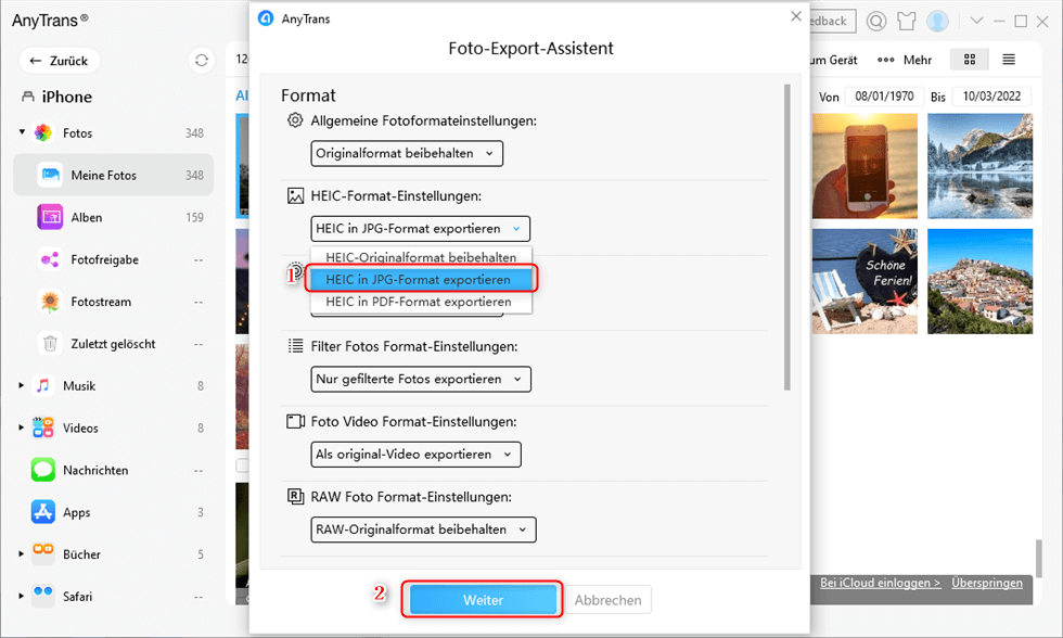 Schritt 3: Wählen Sie auf dem Pop-Up-Fenster „HEIC in JPG-Format exportieren“ unter „HEIC-Format-Einstellungen“ > Klicken Sie dann auf „Weiter“.