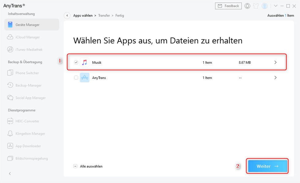 Schritt 3: Wählen Sie eine App, um die Musik zu empfangen > Dann klicken Sie auf „Weiter“, die Übertragung wird schnell fertig sein.