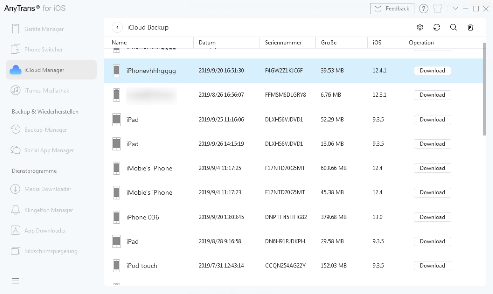 Schritt 3: Klicken Sie bitte „iCloud Backup“ > Ein iCloud Backup von der Liste downloaden. Standardmäßig wird Ihre erstellten iCloud-Backup automatisch aufgelistet.