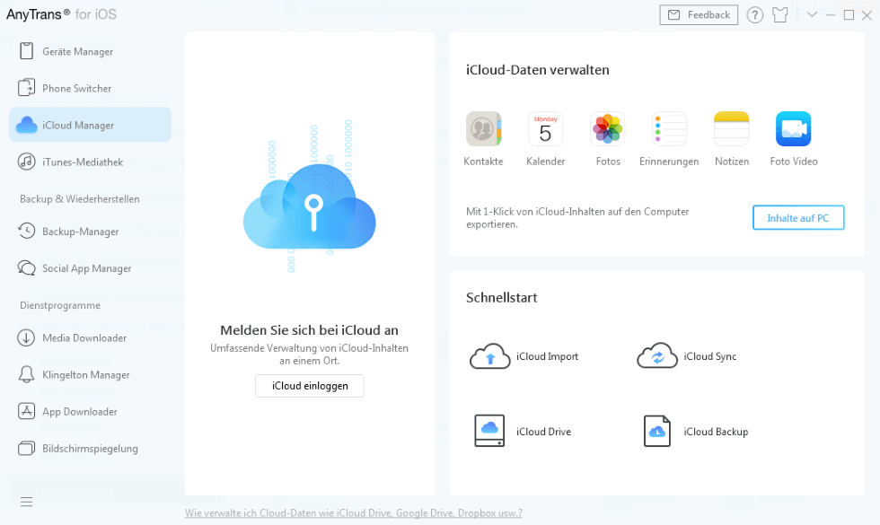 Schritt 1: Laden Sie AnyTrans auf Ihrem Computer herunter > Starten Sie AnyTrans am Computer >Wählen Sie die Option iCloud Manager > Melden Sie sich Ihrem iCloud-Konto an > Klicken Sie auf die Schaltfläche „iCloud einloggen“, um sich in Ihrem iCloud-Konto einzuloggen.