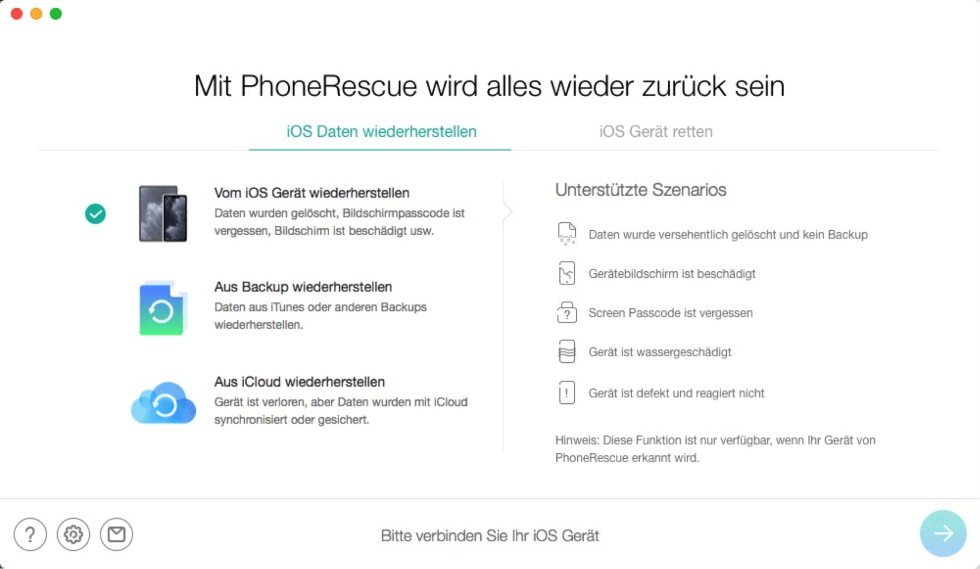 Schritt 1: PhoneRescue – iOS Datenrettung auf dem Computer downloaden > Ihr iPhone an den Computer schließen > Laufen Sie PhoneRescue > Wählen Sie „Aus dem iOS Gerät wiederherstellen“ aus .