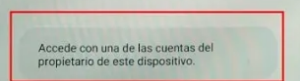 Este mensaje, “Accede con una de las cuentas del propietario de este dispositivo”, aparece al configurar un dispositivo Android después de un restablecimiento. Esto se debe a una capa de seguridad conocida como Protección contra Restablecimiento de Fábrica o simplemente Bloqueo FRP. Tras un restablecimiento, la FRP se activa y muestra este mensaje, impidiendo el acceso hasta que el propietario del dispositivo inicie sesión.