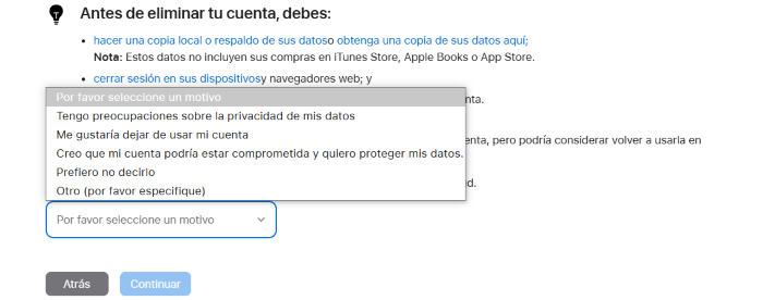 Paso 4: Lee las advertencias y continúa. Apple te mostrará un resumen de lo que implica eliminar tu cuenta, incluyendo las consecuencias. Lee cuidadosamente toda la información, elige una razón para eliminar tu cuenta y presiona “Continuar”.