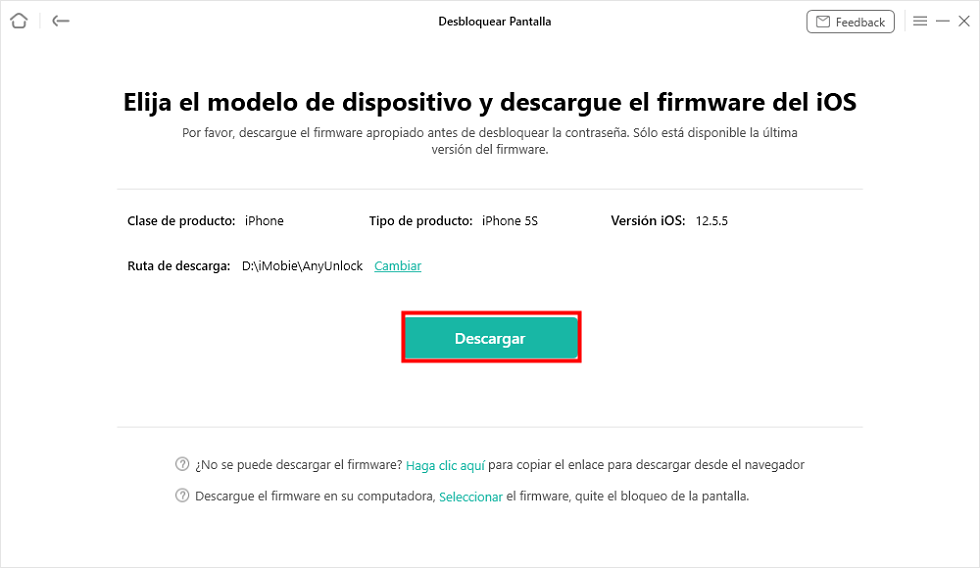 Paso 2. Descarga el firmware iOS antes de eliminar el código de acceso de la pantalla del iPhone, esto es necesario para desbloquear el código de acceso de la pantalla.