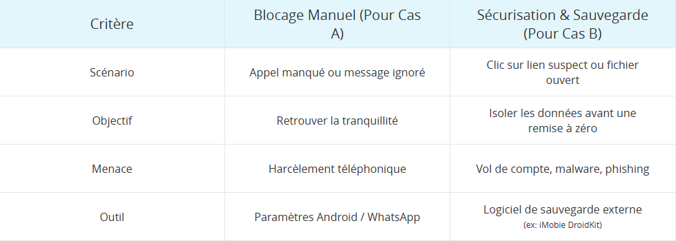 | Critère | Blocage Manuel (Pour Cas A) | Sécurisation & Sauvegarde (Pour Cas B) |