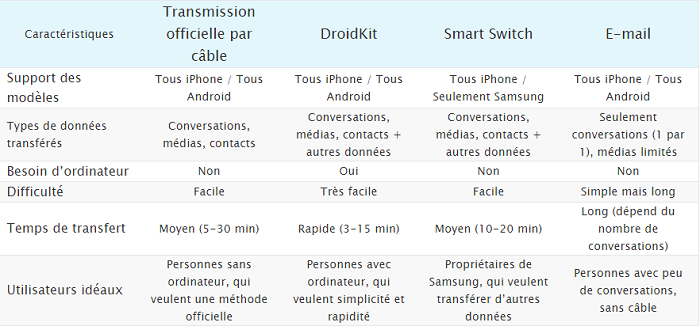| Caractéristiques | Transmission officielle par câble | DroidKit | Smart Switch | E-mail |