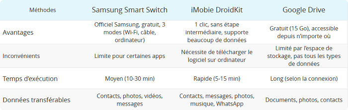 | Méthodes | Samsung Smart Switch | iMobie DroidKit | Google Drive |