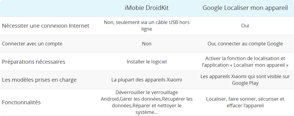 Voilà, ce sont les deux solutions pour débloquer le code de verrouillage Xiaomi oublié. Si vous souhaitez déverrouiller votre appareil le plus vite possible, vous pouvez essayer iMobie DroidKit. Ce logiciel professionnel vous aide à supprimer le verrouillage d’écran de tout type en un clic. De plus, il est capable de retrouver et récupérer les données perdues sur Android. Ne vous hésitez pas à l’essayer ! Voici un tableau comparatif qui présente les caractéristiques des deux solutions.