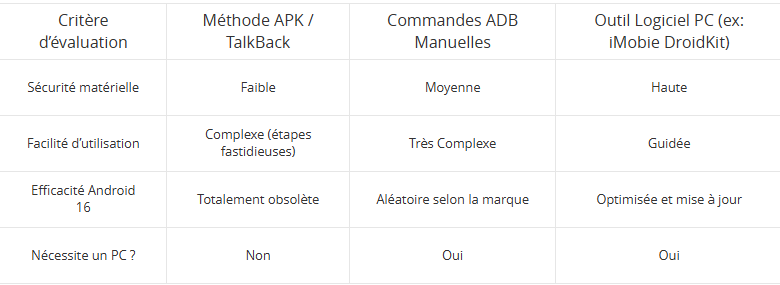 | Critère d’évaluation | Méthode APK / TalkBack | Commandes ADB Manuelles | Outil Logiciel PC (ex: iMobie DroidKit) |