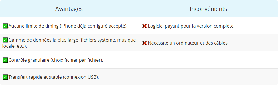| ✅Aucune limite de timing (iPhone déjà configuré accepté). | ❌Logiciel payant pour la version complète |